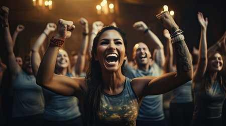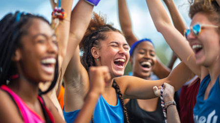 Celebrate the power of teamwork as a womens team exuberantly rejoices in victory. The collective joy and triumph radiate the spirit of successful collaboration.