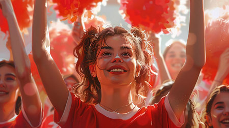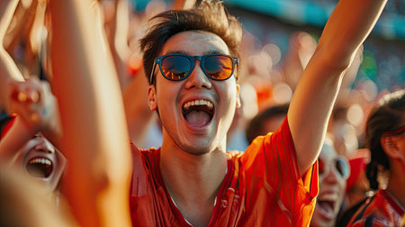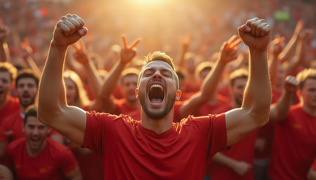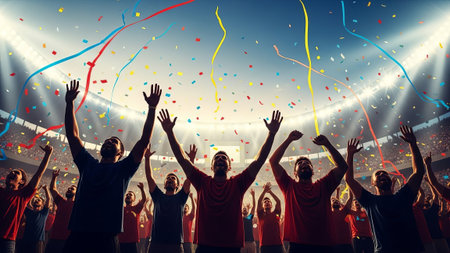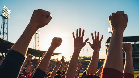 A group of enthusiastic sports fans cheering with raised hands in a stadium filled with sunlight. The energy and excitement of the crowd create a dynamic atmosphere of celebration.