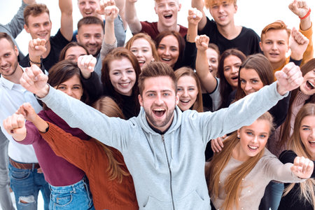Group of happy fans cheering and supporting their favorite team on the stadium