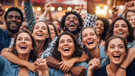 A diverse group of people are seen laughing and celebrating. The image shows a close-up of many faces with eyes closed in joy. Warm lighting illuminates the scene, suggesting an outdoor gathering. Suitable for various uses, this image captures celebration and happiness.