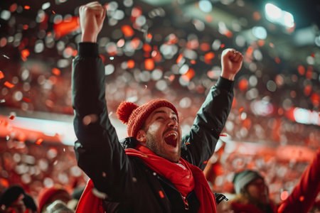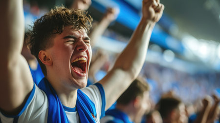 A young fan at a soccer championship raises his arms in excitement, adding to the energetic gestures of the crowd, creating a fun and happy atmosphere at the event. AIG41