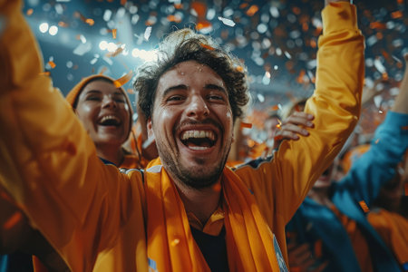 Fan football, Celebrating the success. Supporters cheer in bleacher. Generative Ai