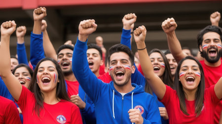 A diverse group of sports fans are shown cheering with excitement, raising their fists in celebration of a win, with painted faces and team colors.