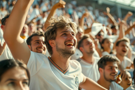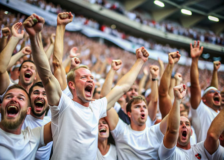 Euphoric atmosphere in a packed football stadium as enthusiastic fans clad in white shirts celebrate their team's triumph with unbridled joy and energetic cheer.