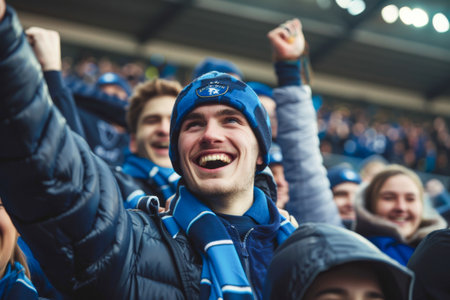 Enthusiastic French rugby fans cheering in the stands at a match. Concept French Rugby Fans, Rugby Match, Enthusiastic Cheering, Stands, France