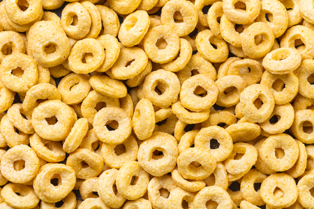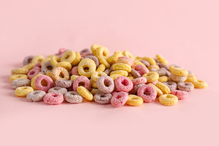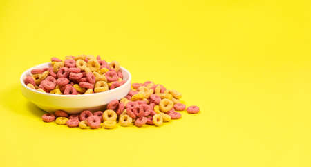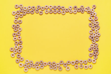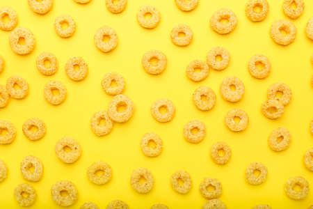 colorful breakfast cereals on yellow background top view, rounded breakfast cereal texture