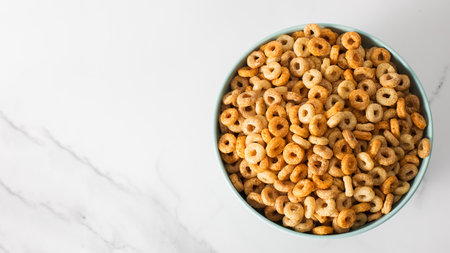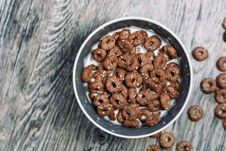 A bowl of round crispy cereal with milk. Healthy breakfast. Copy space