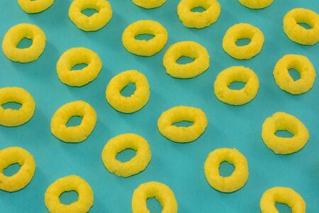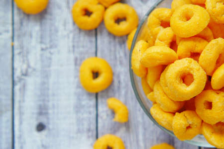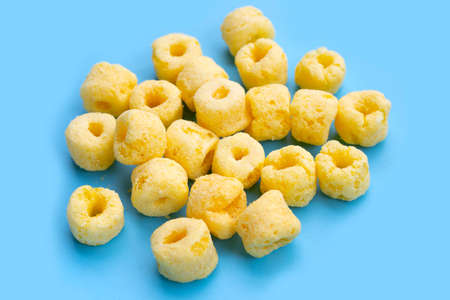 Detail of a snack based on flavored cheese puff, with corn flour and hydrogenated fats.