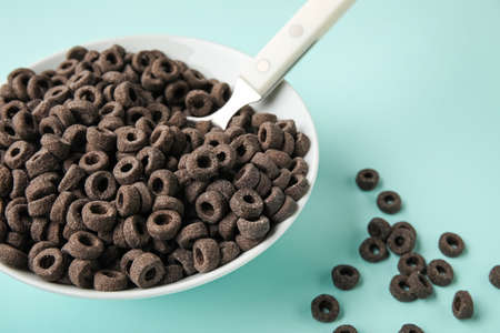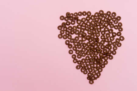 Chocolate organic breakfast cereals. Background healthy cornflakes