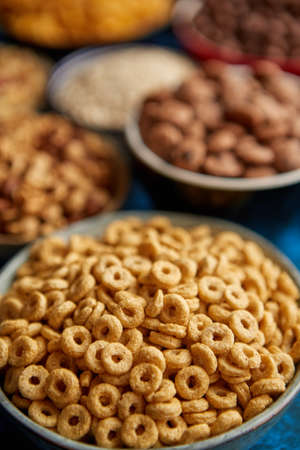 Assortment of various kinds cereals placed in ceramic bowls with cornflakes, granola, cereals and oatmeal. Flat lay, top view on blue rusty table with copy space in the middle. Selective focus.