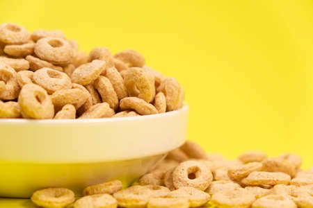 Corn childhood appetizing cereal, rings, in a yellow plate on white background.