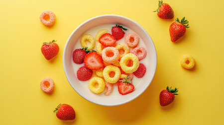 A bowl of multicolored cereal rings with milk and strawberries, placed on a yellow background, offering a lively and joyful breakfast visual