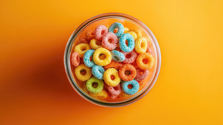 A jar of colorful cereal rings against an orange backdrop, offering a vibrant and cheerful image for breakfast or snack-related visuals.