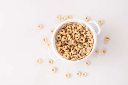 healthy cereal rings on a white background in a plate and scattered on the table. morning eat. Healthy children's breakfast. Dry muesli. top view.