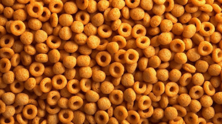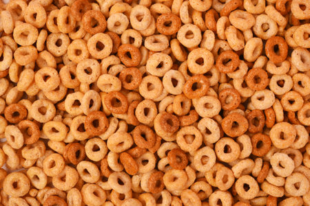 delicious oat cereal in large pile, cereal background, delicious and useful breakfast, frame with rings breakfast cereal