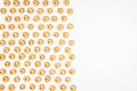 childrens dry breakfast colored corn rings on a white background with a place for text