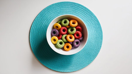 Colorful Cereal Rings in a White Bowl on a Turquoise Placemat