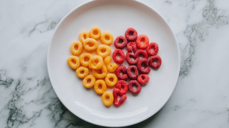 Rainbow cereal rings forming a heart shape on a white plate over marble countertop