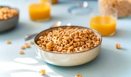 Healthy Round Oat Breakfast Cereal with Whole Milk and Juice