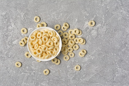 Top view on healthy and tasty ringlets dry breakfast in white bowl on gray concrete background with copy space