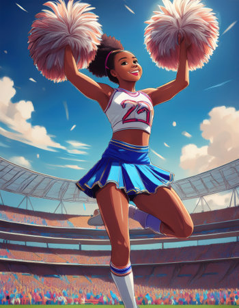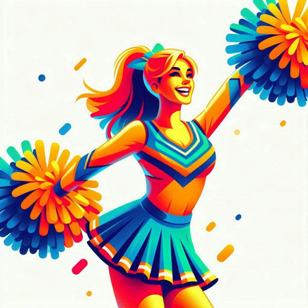 A vibrantly illustrated cheerleader dances joyfully with pom-poms at a college football game.