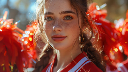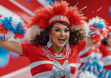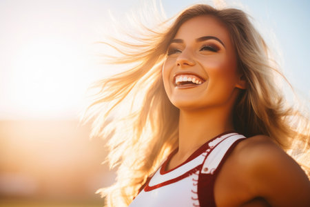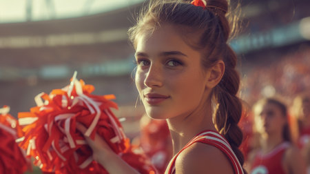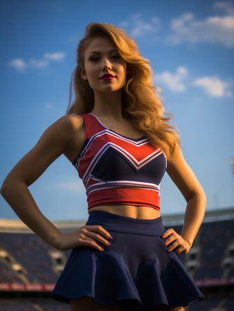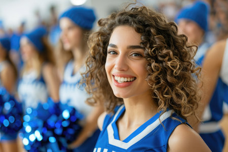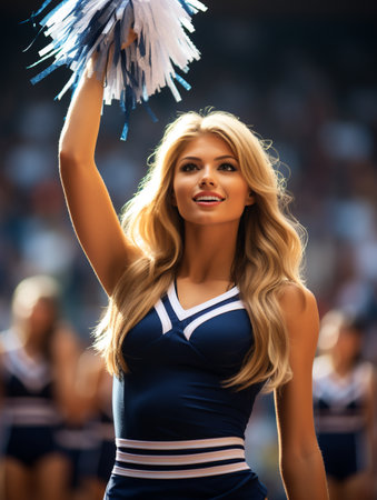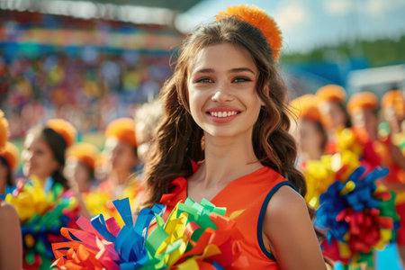 A cheerful cheerleader, adorned in colorful attire, smiles brightly as she leads her squad during an exhilarating sports event. The atmosphere is lively and filled with excitement.