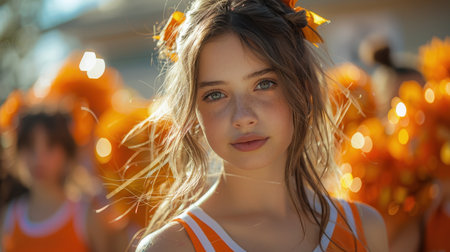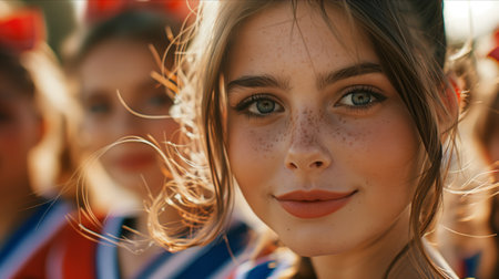A close-up portrait of a young cheerleader with the sunlit stadium in the background.