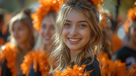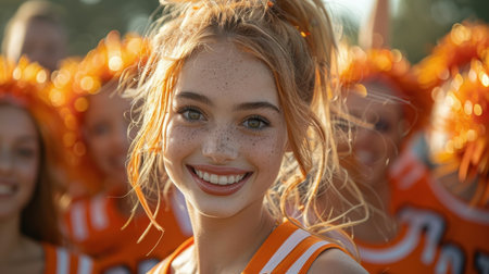 A lively portrait of smiling young women, members of an American football team's cheerleading squad, radiating enthusiasm and energy