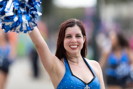 Portrait of a cheerleader during a sports match. Cheerleaders at sporting events.