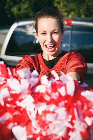Tailgating: Woman Holding Poms Cheers For Team