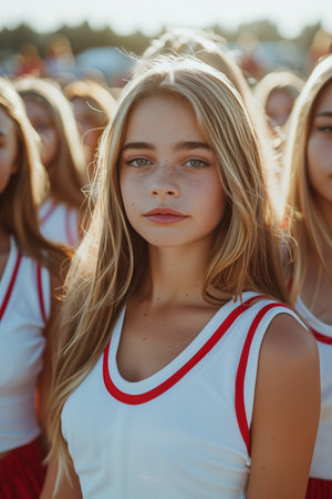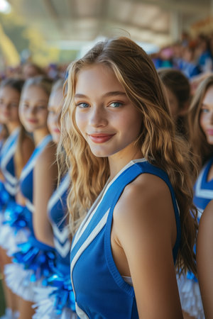 Young attractive cheerleader standing in a row. Blue pom-poms are held tightly in their hands, adding a pop of colour to the image. Perfect for conveying the excitement and energy of sporting events.