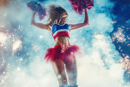Cheerful dancer showcases energetic movements with pom poms as fireworks light up the night sky.