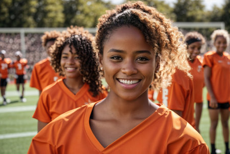 Happy African American female American football player on the field with her team, wearing orange uniforms. African-American Female Football Player Playing American Football on the Field, Dressed in Orange Uniform.