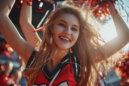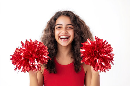 Cheerful young woman at a sports event, holding red pompoms, bright and energetic atmosphere
