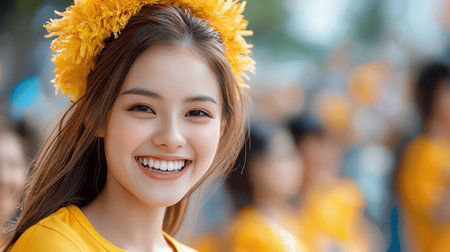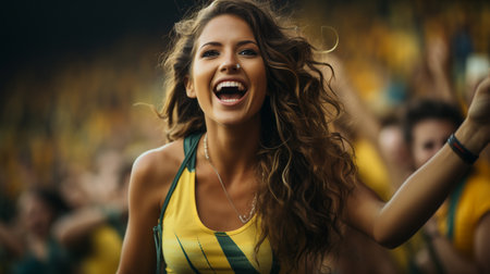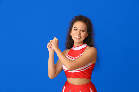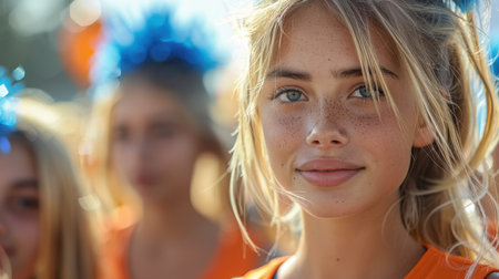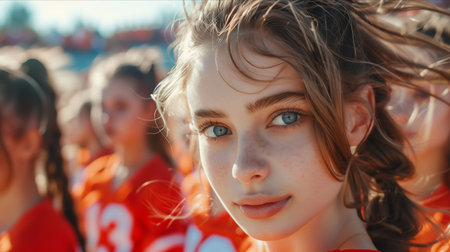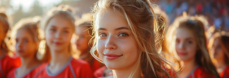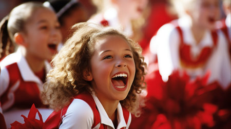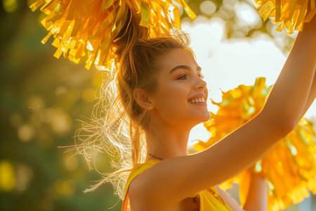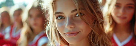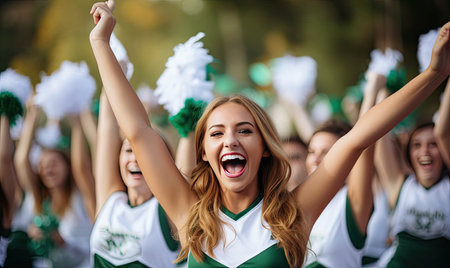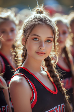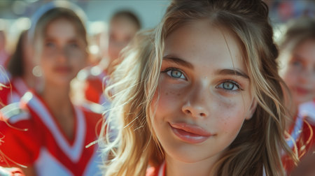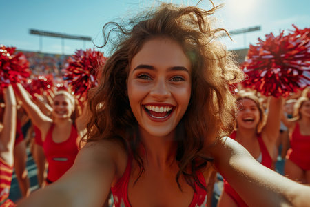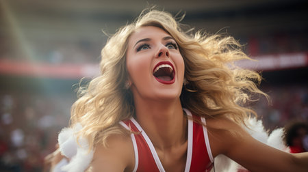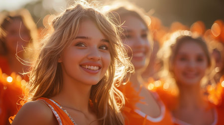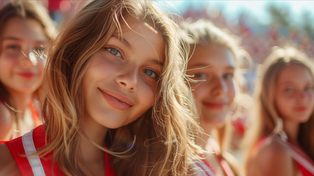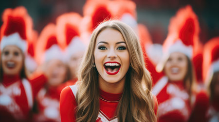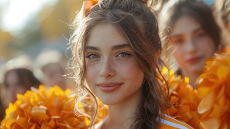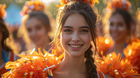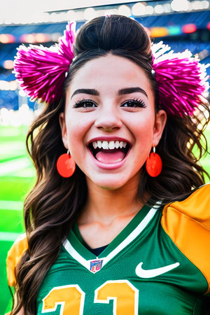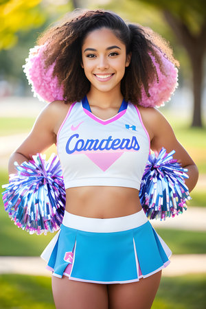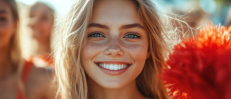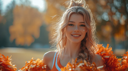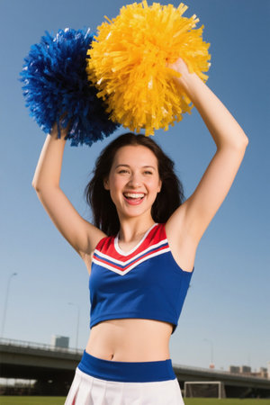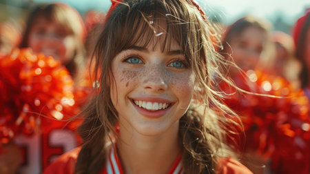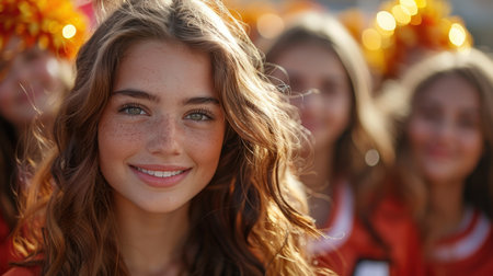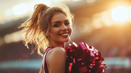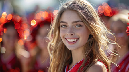 A cheerful cheerleader, adorned in colorful attire, smiles brightly as she leads her squad during an exhilarating sports event. The atmosphere is lively and filled with excitement.