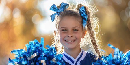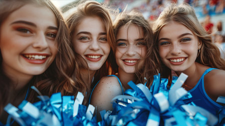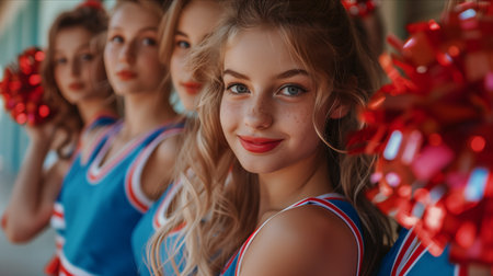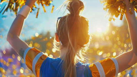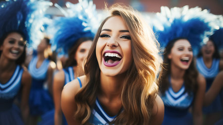 Cheerleader with team, radiant confidence, dynamic sports atmosphere, blue and gold.