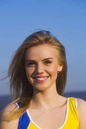 Front view portrait of smiling woman who doing sport. Sport concept, healthy lifestyle.