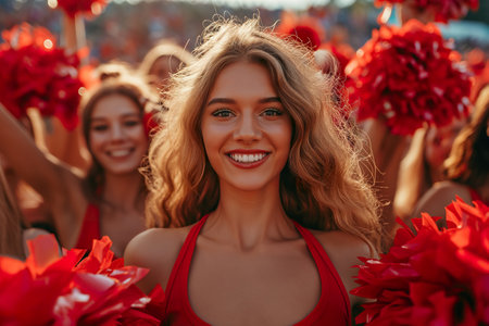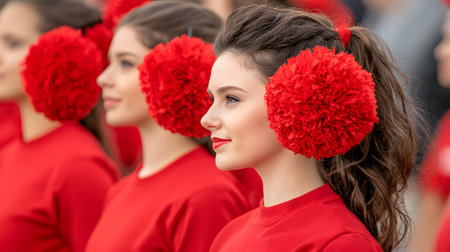 Cheerleaders in striking red outfits stand in formation, showcasing large red pom-poms, embodying spirit.