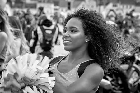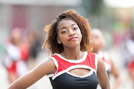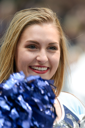 Portrait of a cheerleader during a sports match. Cheerleaders at sporting events.