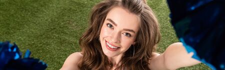 overhead view of sexy happy cheerleader girl in blue uniform sitting with pompoms on green field, panoramic shot
