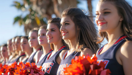 A lively portrait of smiling young women, members of an American football team's cheerleading squad, radiating enthusiasm and energy