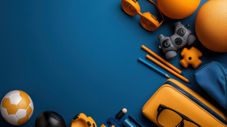 A blue background with a variety of sports equipment and school supplies. Scene is playful and fun, with the sports equipment and school supplies suggesting a mix of leisure and education