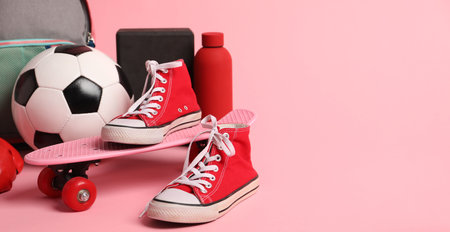 Sneakers, water bottle, backpack and sports equipment on pink background, closeup. Space for text