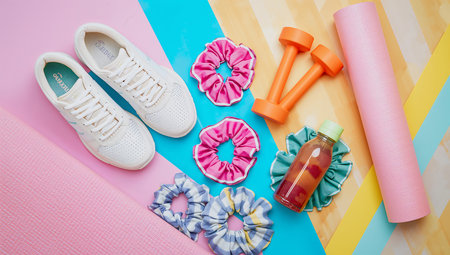 A selection of fitness accessories on a pastel backdrop. Creating using generative AI tools