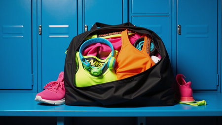 A vibrant locker room scene showcases an open gym bag full of neon workout gear on an electric blue bench
