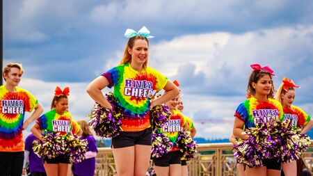 Portland, Oregon, USA - June 6, 2015: University of Oregon cheerleaders in the Grand Floral Parade during Portland Rose Festival 2015.