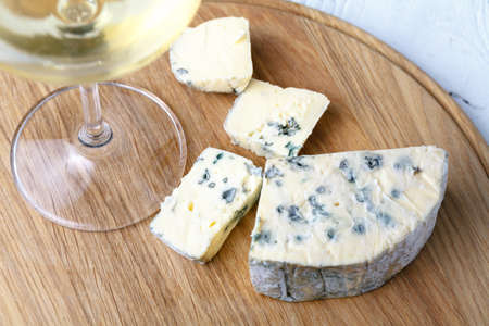Composition with wine and Flatley cheese. Cheese with a blue noble mold on a wooden Board.