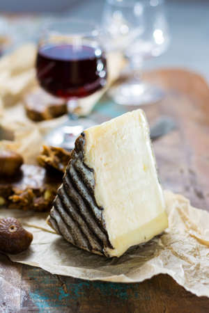 Sweet dessert liqueur wine in glass, hard french cheese Tomme de Montagne and dried figs with figs bread, still life