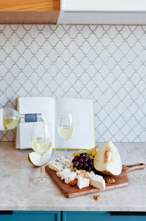 Glasses with sparkling wine and bottle in kitchen. Open book, juicy melon, grapes, nuts and fragrant pieces of cheese on wooden board. Champagne and delicious snacks for romantic date at home