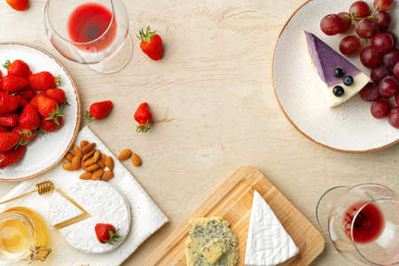 Beautiful composition with strawberry, grapes, cheese and blueberry cheesecake